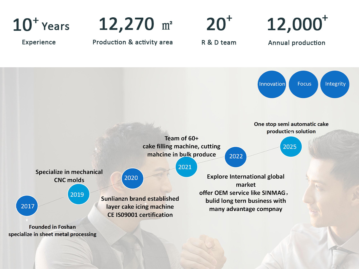 At Nanhua international trade (Foshan) Co. Ltd,, is belong to the factory Guangdong Sunlian Intelligence Co. Ltd,, we specialize in providing semi-automatic cake production line solutions, designed for small and medium-sized cake factories. Our mission is simple: help bakeries and food producers, increase production capacity while reducing labor costs, with intelligent and reliable equipment.